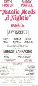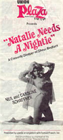 Bambi, Jr. may have been complaining about her image then, but she was eager to ballyhoo her stripping background when the program for Natalie was being written. The copy, which she approved, stated: "Bambi, Jr born into a show business family, Bambi began modeling at three and, while she initially was inclined toward an acting career later in life, she opted for stripping when she determined the financial rewards were larger in burlesque than in movies. A graduate of Valley High School in Las Vegas and former student at the University of Nevada, Las Vegas, she elected to open her ecdysiast career in the desert city in three major strip hotels. She recently sold a record to a New York company and soon will be involved in a video production, Bambi Jr. welcomed the opportunity to appear in Natalie, which will prepare her for her new goals of legitimate theatreand movies."