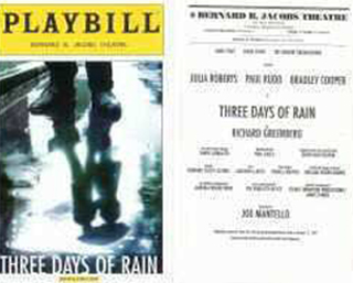 The fact that she is miscast in Three Days of Rain isn't her fault. More relaxed during previews, it shouldn't have been a jaw dropper that she appeared terrified on opening night.