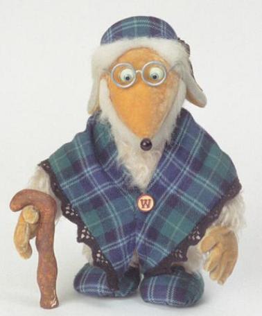 An articulated, poseable puppet of the Womble 'Great Uncle Bulgaria', made by FilmFair Limited in the United Kingdom, around 1997. This puppet was used in the 1998 series of The Wombles, made by FilmFair for HTV. The Wombles were fictional creatures that lived in burrows on Wimbledon Common and collected rubbish left by humans.