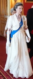 Princess Anne wore a new hairdo topped with the Festoon Tiara, a gift from the World Wide Shipping Group. She also wore diamond jewelry that was an 18th birthday gift from her parents, Queen Elizabeth and Prince Philip.