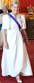 Royal women traditionally wear full-length ball gowns to state banquets, often featuring a fitted bodice and full skirt. The dress code is the most formal level of dress, requiring such gowns along with tiaras and, in some cases, long gloves, though these are less common at modern events.