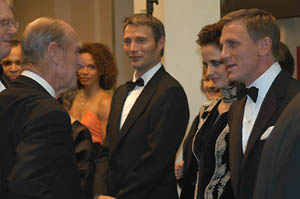 Prince Phillip meets the cast and crew members from Casino Royal including bad guy Mads Mikkelsen, Bond girl Eva Green and Daniel Craig. Photo Buckingham Place Press Office