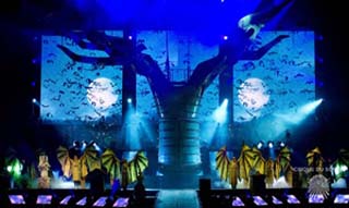 According to he show's official press kit: The color palette chosen for the show is rich, lively, and ornate such as through the usage of gold and crystals. The design team explored such technologies as 3D printing and LED lighting for the many different colored pieces.